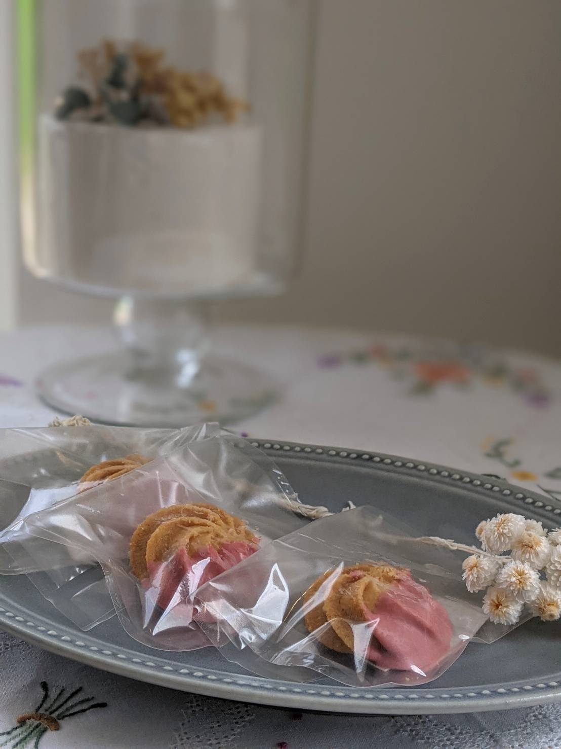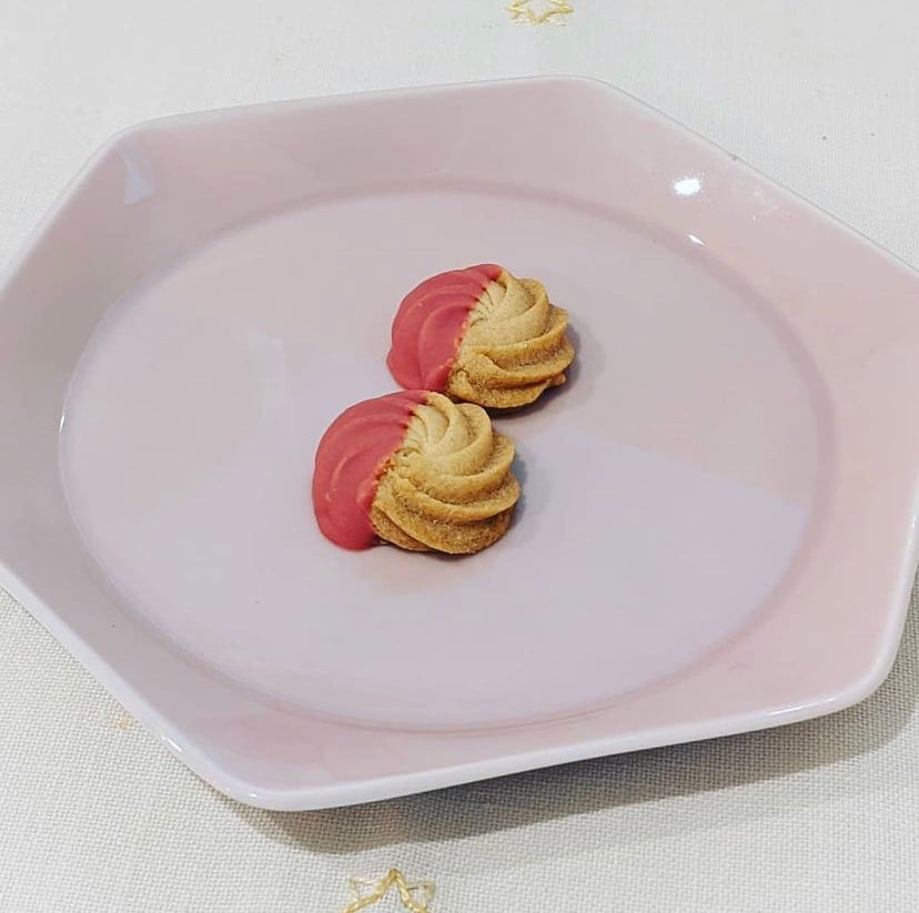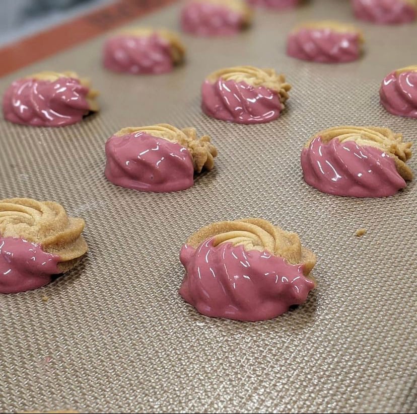 バラのお花のように絞ったクッキーに、苺チョコレートを半分付けました。